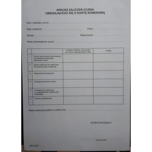 0148 Arkusz zaliczeń ucznia ubiegającego sie o kartę rowerową MEN VI/28