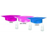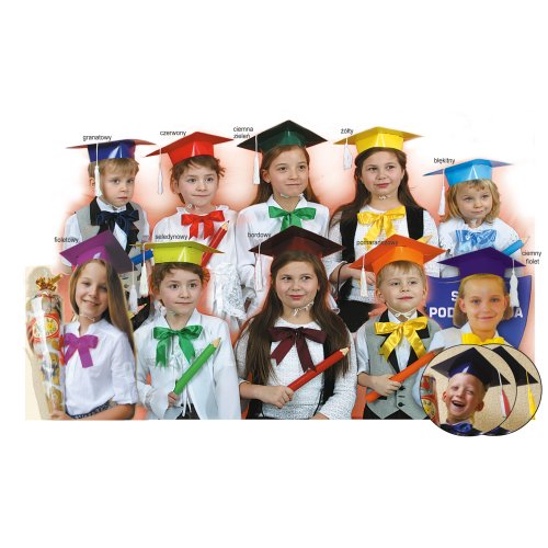 Biret kartonowy w zestawie z białym dzyndzelkiem i gumką zakuwaną podtrzymującą biret.