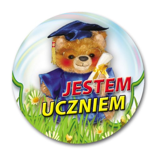 Przypinany na zabezpieczoną agrafkę znaczek typu button.