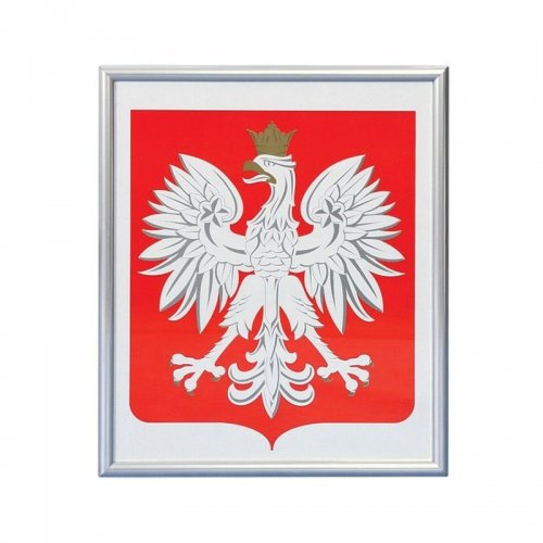 Godło oprawiane w aluminiowe ramy.