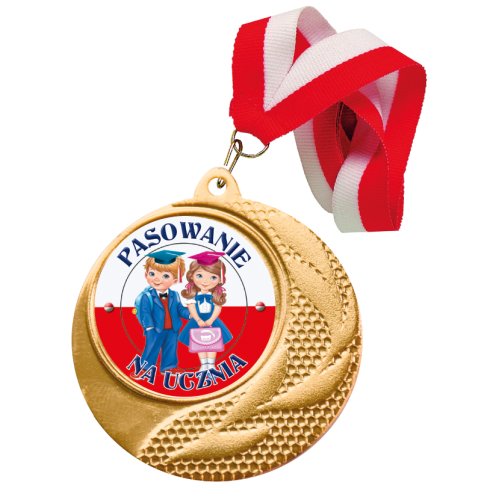 Metalowy, złoty medal  (średnica 5 cm ) z kolorową wklejką o średnicy 2,5 cm,