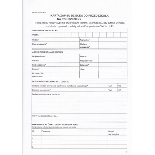 0853 Karta zapisu dziecka do przedszkola