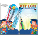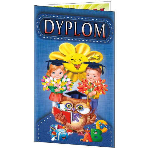 Dyplom składa się z czterech elementów: - błyszczącej sztancowanej okładki z dwiema wewmętrznymi zakładkami, - dyplomu wkładki z tekstem, - 2 zakładek do książek: z cytatem o książkach (wym. 216x40 mm) i życzeniami (wym. 239x85 mm)