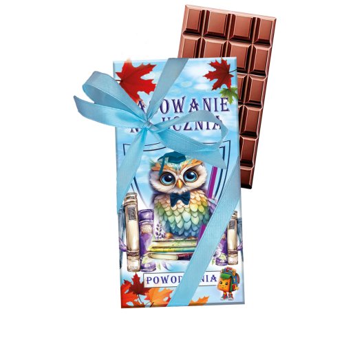 Czekolada polskiego producenta 100 gram w orygianlnym opakowaniu umieszczona w okolicznościowym, kartonowym opakowaniu PASOWANIE NA UCZNIA, wym. - 16 cm x 7,7 cm Ozdobiona atlasową wstążką (z instrukcją wiązania)