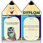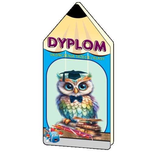 Zaskocz swoich podopiecznych nieszablonowym formatem! Nasz dyplom dla trzecioklasisty (model C130) został precyzyjnie wycięty w kształcie kredki. Na przepięknej, barwnej okładce znajduje się ilustracja uroczej, kolorowej sówki w birecie, która dumnie siedzi na stosie szkolnych książek. Takie innowacyjne dyplomy ozdobne natychmiast przyciągają wzrok, wyróżniając się na tle standardowych dokumentów i stając się ulubioną pamiątką szkolną, a po otwarciu zaskakują wesołą buzią kredki wewnątrz. To idealny upominek dla ucznia na start w starszych klasach.