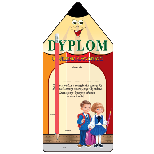 Zapomnij o nudnych, standardowych dokumentach. Ten wyjątkowy dyplom dla drugoklasisty został precyzyjnie wycięty po obrysie w kształcie wesołej, uśmiechniętej kredki. Na pięknej, kolorowej grafice znajdują się sympatyczni, uśmiechnięci uczniowie z plecakami. Dzięki takiemu projektowi, te dyplomy ozdobne zdecydowanie wyróżniają się na tle innych propozycji na rynku. To wspaniała pamiątka szkolna, która pobudza dziecięcą wyobraźnię i idealnie wpisuje się w radosny, przedwakacyjny klimat.