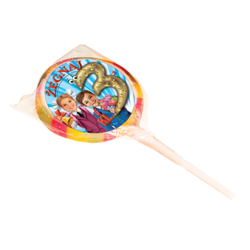 Karmelowy lizak z okolicznościową naklejką.