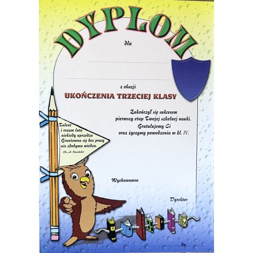Nasz uniwersalny dyplom dla trzecioklasisty z tej klasycznej serii wyróżnia się tradycyjną, urokliwą szatą graficzną, która budzi miłe, nostalgiczne skojarzenia. Na arkuszu widnieje ilustracja mądrej sówki trzymającej duży ołówek, symbolizującej zdobytą wiedzę, a całości dopełnia klasyczna tarcza szkolna oraz detal w postaci małych książeczek. Ponadto, te dyplomy ozdobne zawierają piękny tekst gratulacji za z sukcesem zakończony pierwszy etap edukacji. To idealny wybór dla placówek oświatowych, które cenią sobie klasyczne, sprawdzone pamiątki szkolne.