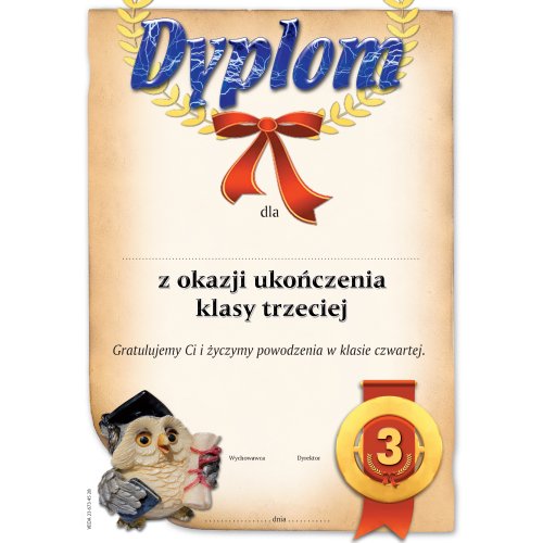 Niezależnie od wybranego motywu, każdy nasz dyplom dla trzecioklasisty charakteryzuje się przepiękną, pełną szacunku, ale wciąż bliską dzieciom szatą graficzną. Oferowane przez nas dyplomy ozdobne łączą w sobie żywe kolory z edukacyjnymi symbolami (takimi jak sowy, stosy książek czy birety), które idealnie pasują na ten ważny moment. Taka starannie wykonana pamiątka szkolna to sprawdzony upominek dla ucznia 3 klasy, który z dumą zawiśnie w antyramie na ścianie dziecięcego pokoju. Wybierając nasze dyplomy dla dzieci, sprawiasz, że pożegnanie z dotychczasowym wychowawcą będzie pełne uśmiechu.