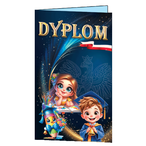 Dyplom składa się z sześciu elementów: błyszczącej sztancowanej mini teczki z dwiema wewnętrznymi zakładkami, dyplomu gdzie wydrukowany jest teskt, trzech zakładek do książek (wym. 21,6 x 4 cm), kolorowego drewnianego ołówka z gumką (18,6 cm) wpiętego w kartonową tarczę (wys. tarczy 7,5cm).